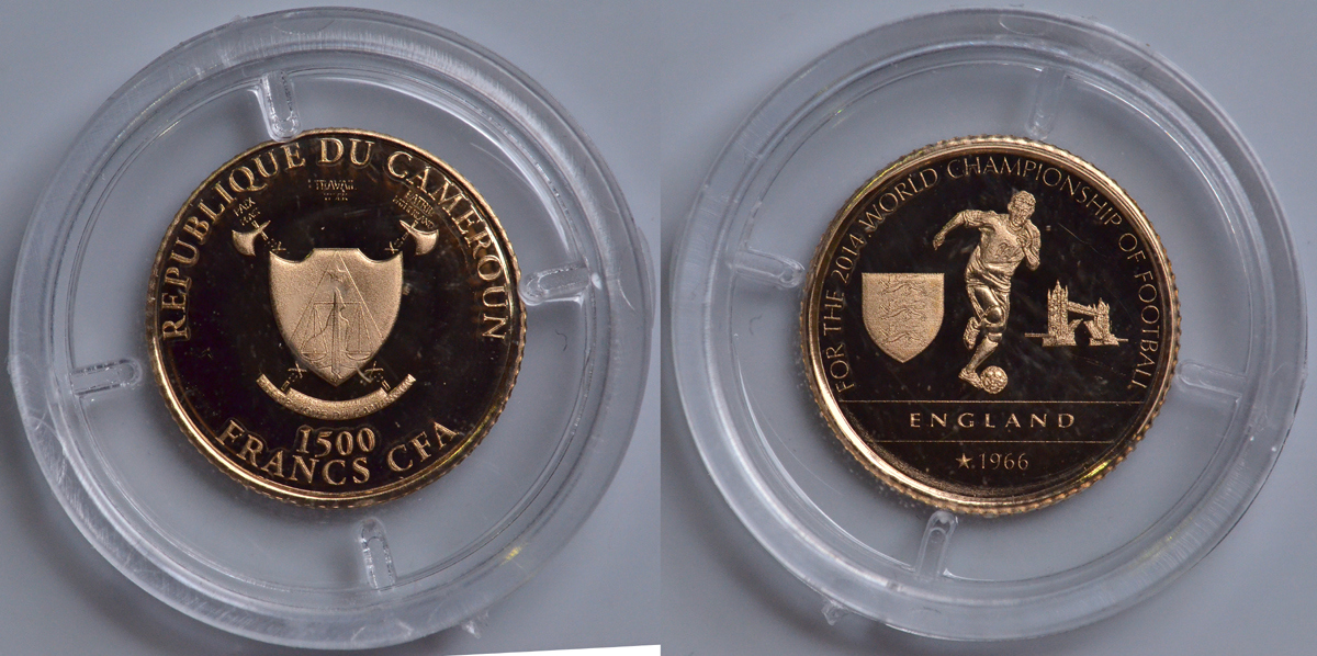 КАМЕРУН 1500 ФРАНКОВ 2014 ЧЕМПИОНАТ МИРА ПО ФУТБОЛУ - 2014, ВЕЛИКОБРИТАНИЯ - ГОДЫ ЧЕМПИОНСТВА, ИГРОК С МЯЧОМ НА ФОНЕ ТАУЭРСКОГО МОСТА KM NEW золото PROOF 00-000-00