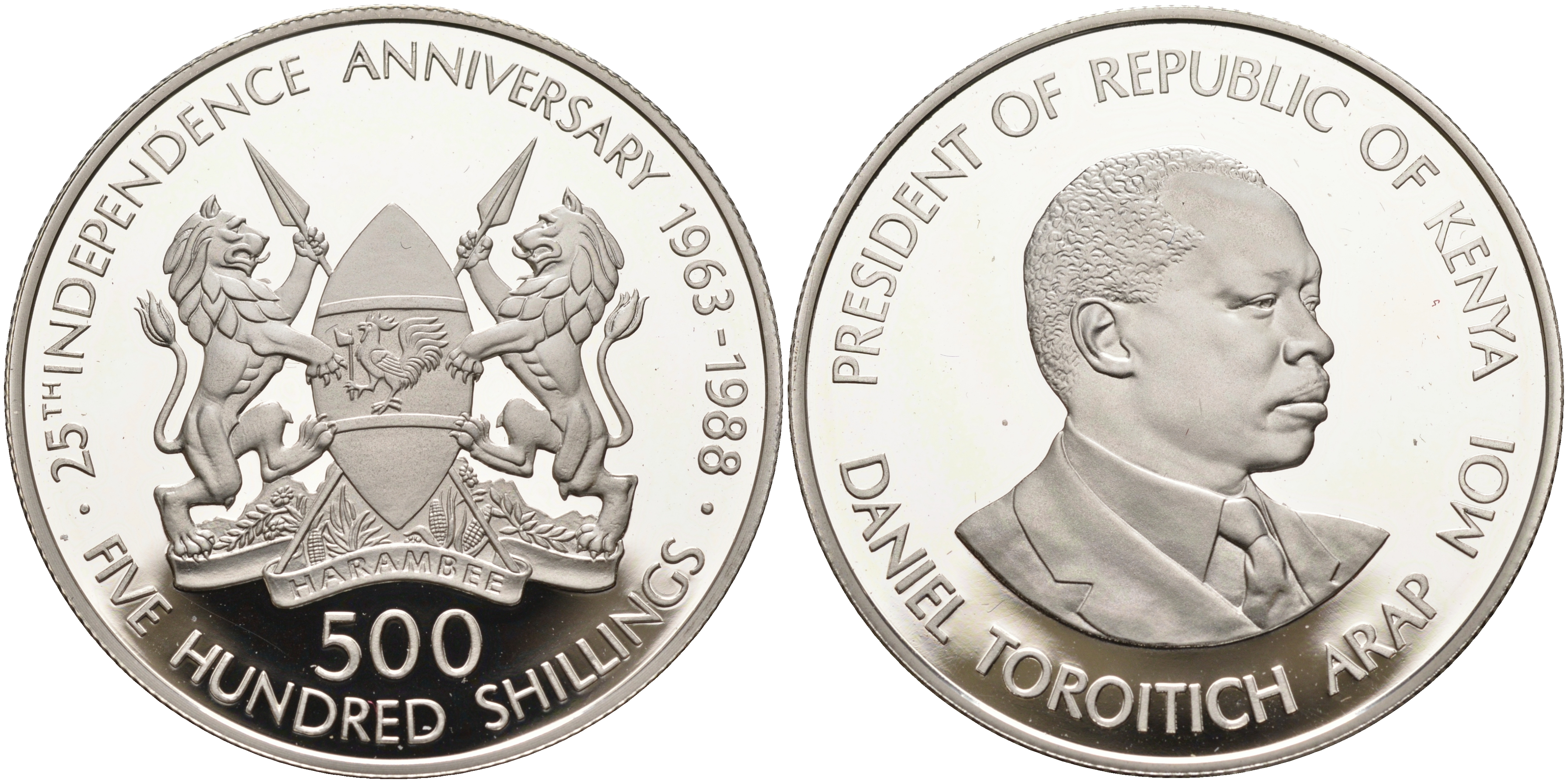 Кения 500 шиллингов 1988 25 лет независимости, Даниель арап Мои, тираж 375 экземпляров КМ 25 серебро PROOF 10-015-04