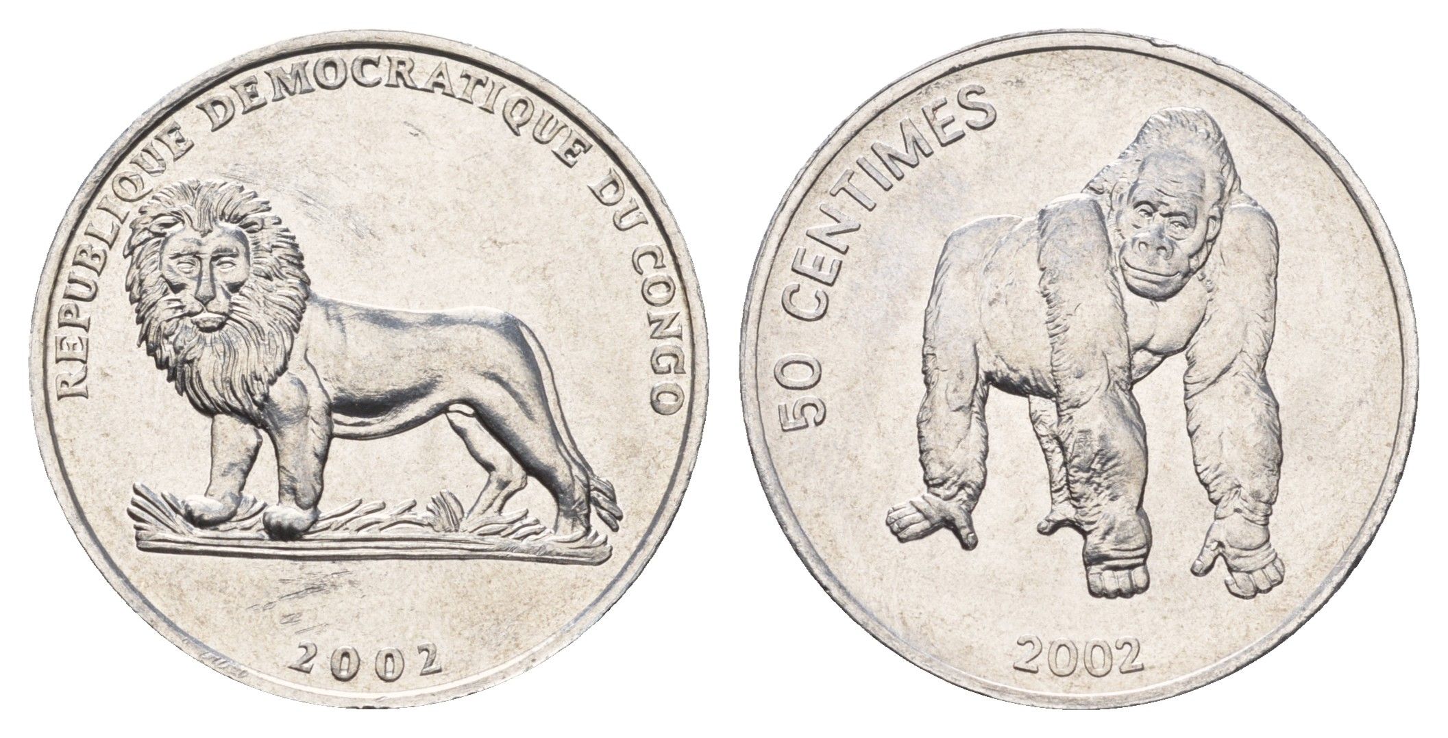 ДР Конго 50 сантимов 2002 Животные - Горилла KM 79 алюминий UNC 4678-125