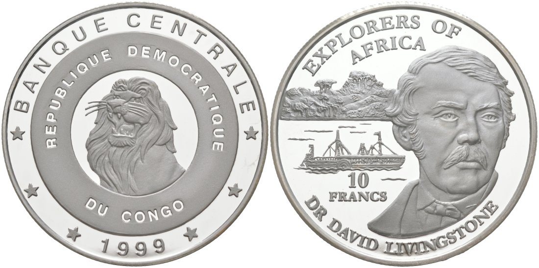 Конго 10 франков 1999 исследователи Африки - доктор Давид Ливингстон, тираж 10000 экз., в коробке, с сертификатом KM 20 серебро PROOF 3-4-3-48