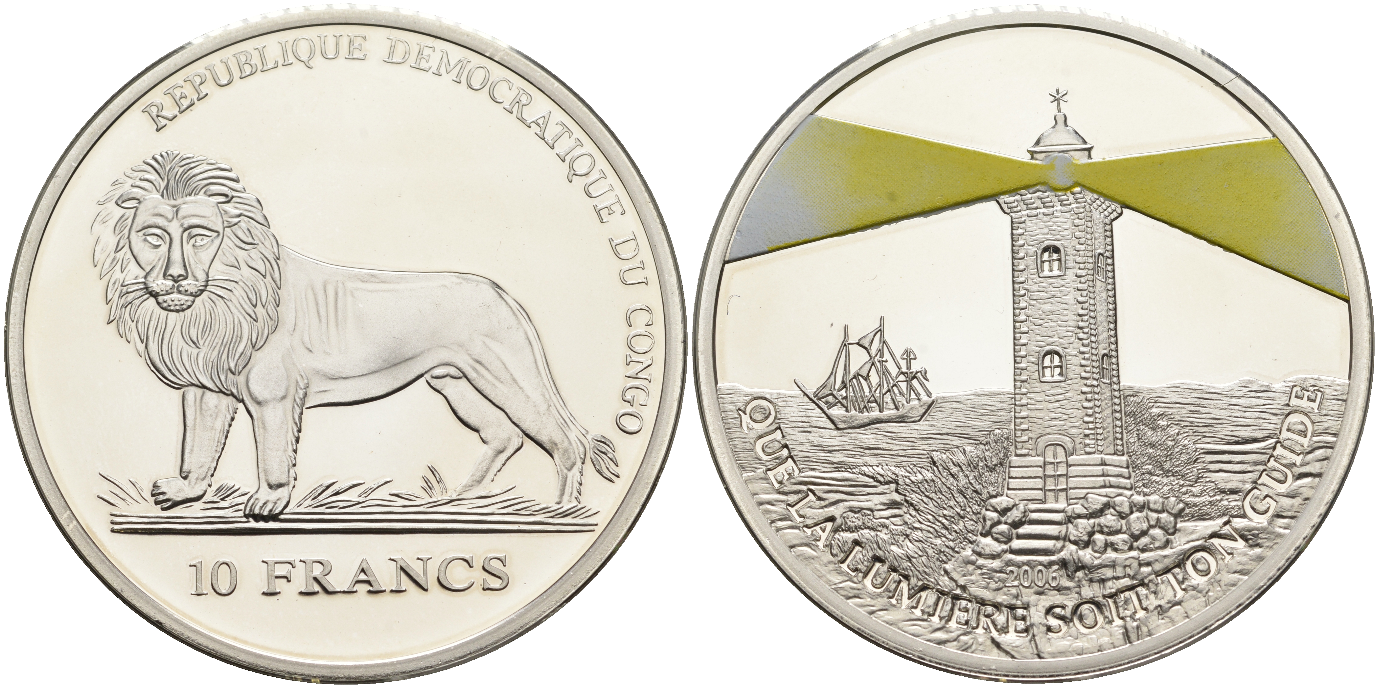 Конго 10 франков 2006 маяк, корабли, светится в темноте, тираж 2500 экз. серебро PROOF 4-5-3-02