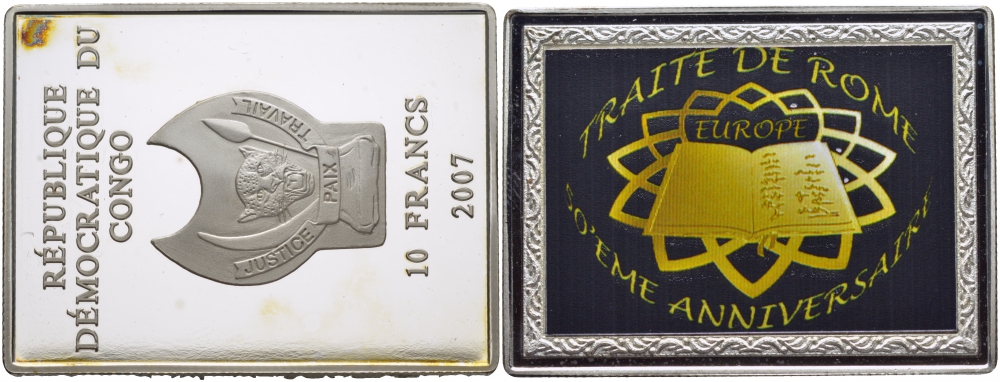 Конго 10 франков 2007 50 лет Римскому договору, прямоугольная, цветная эмаль серебро PROOF 1079-6-31