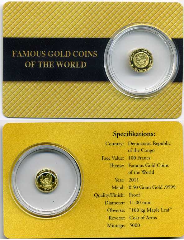 Конго 100 франков 2011 серия известные монеты, Канада 100 килограмм, сертификат, буклет KM NEW золото PROOF 4-3-1-18