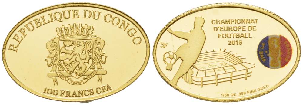 Конго 100 франков 2016 чемпионат Европы по футболу во Франции, овал, эмаль KM NEW золото PROOF 00-806-42