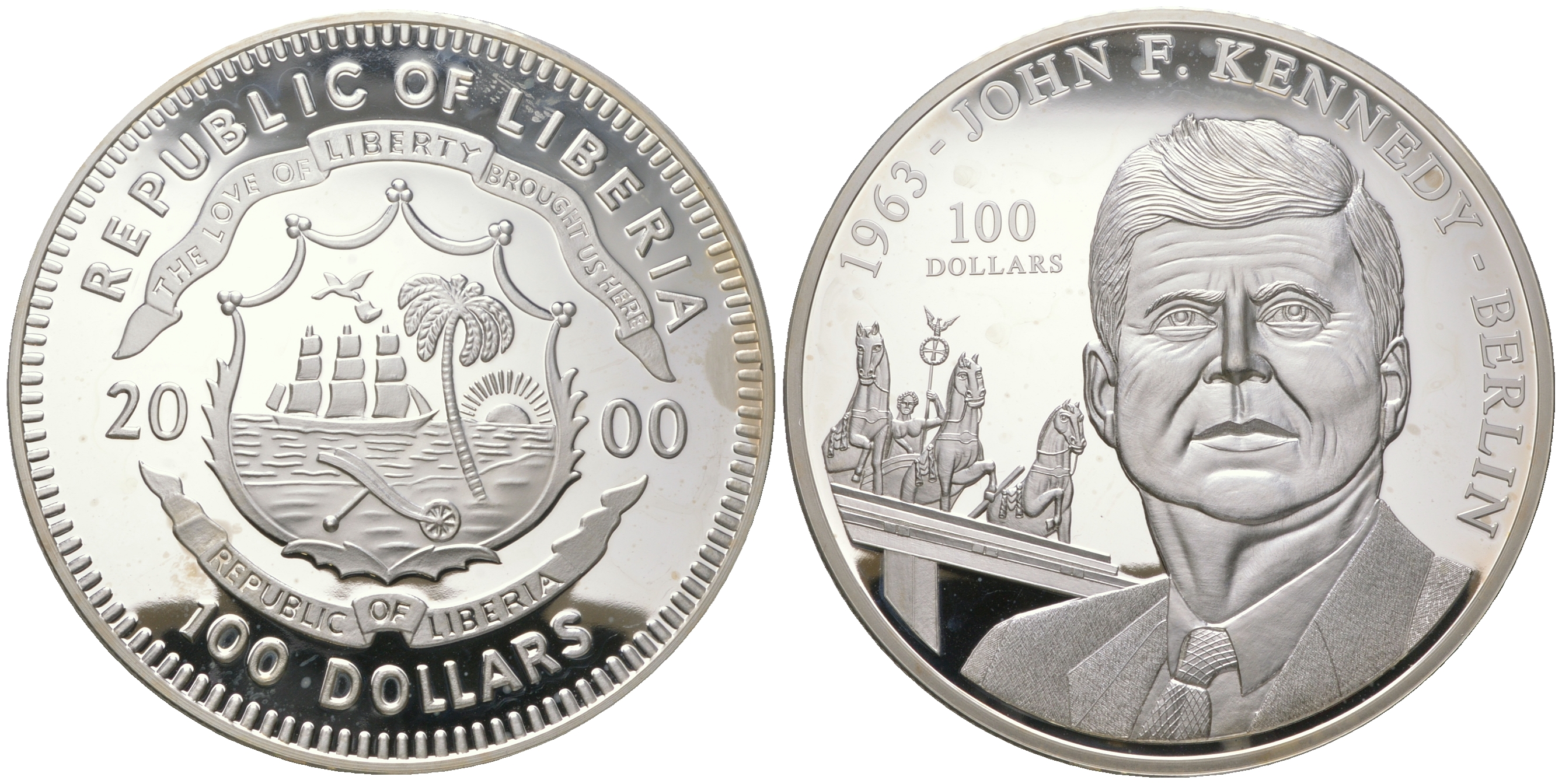 Либерия 100 долларов 2000 Джон Кеннеди, историческая речь в Берлине в 1963 году, Бранденбургские ворота, диаметр 80 мм., вес 250 грамм серебро PROOF 11-169-22-1