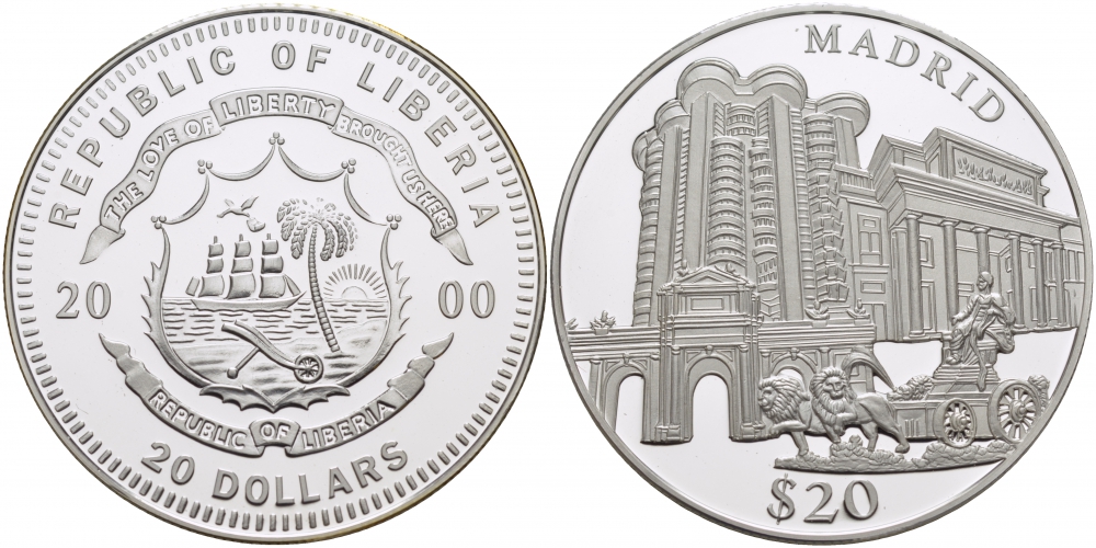 Либерия 20 долларов 2000 серия памятники архитектуры, Мадрид KM 640 серебро PROOF 01-107-34
