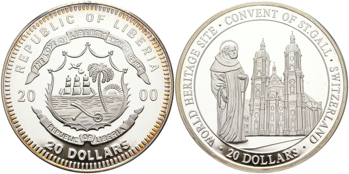 Либерия 20 долларов 2000 серия объекты всемирного наследия, монастырь святого Галла в Швейцарии серебро PROOF 11-155-23
