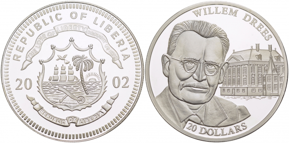 Либерия 20 долларов 2002 Виллем Дрес, Премьер-министр Нидерландов (1948-1958) LR-001660 серебро PROOF 11-282-13