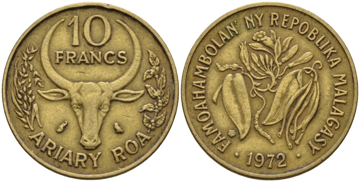 Мадагаскар 10 франков 1972 KM 11 алюминиевая бронза 4141-615