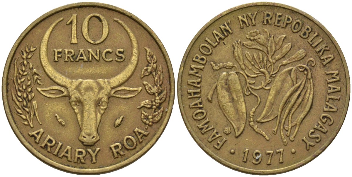 Мадагаскар 10 франков 1977 KM 11 алюминиевая бронза 4141-616
