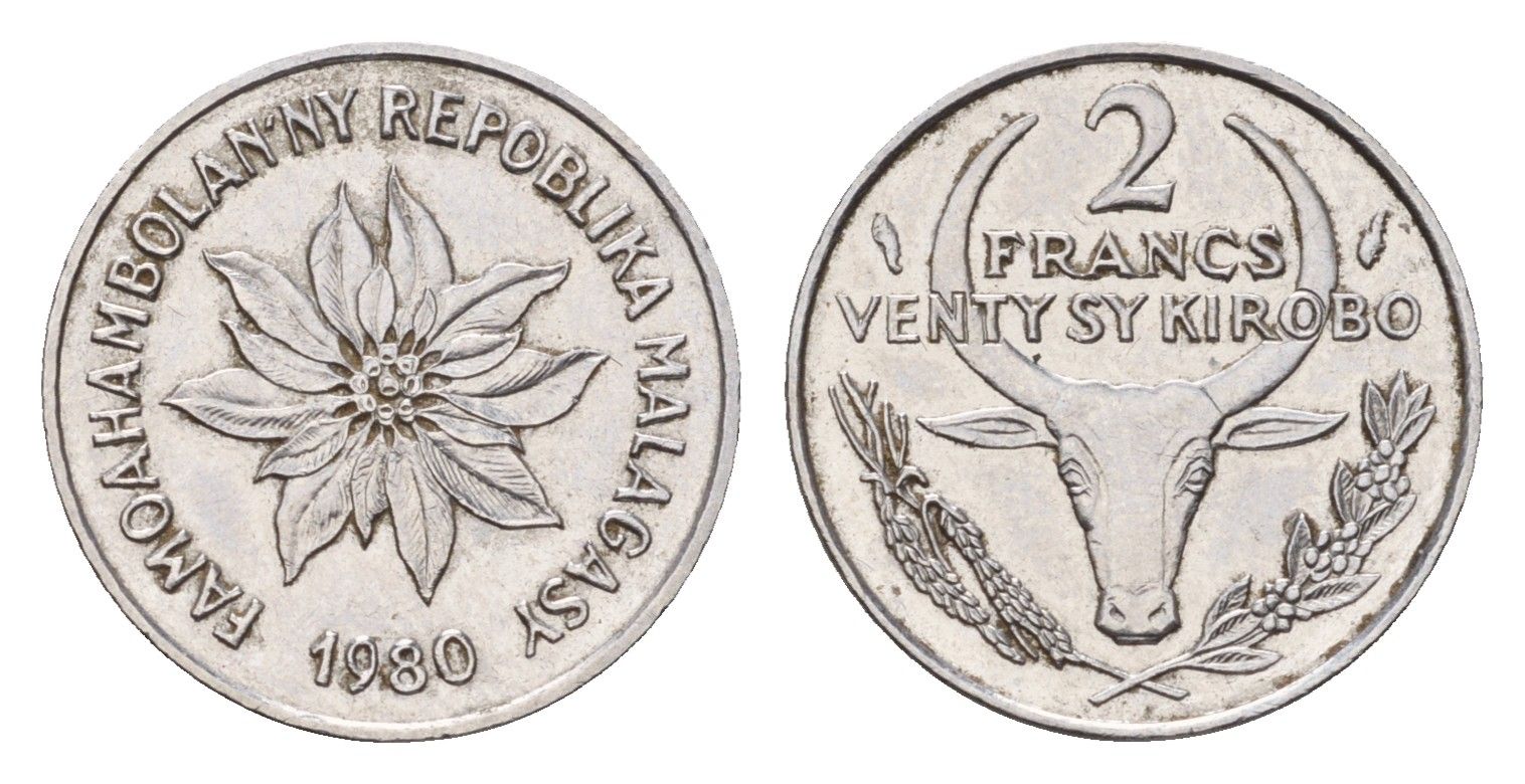 Мадагаскар 2 франка 1980 KM 9 нержавеющая сталь 4588-1026
