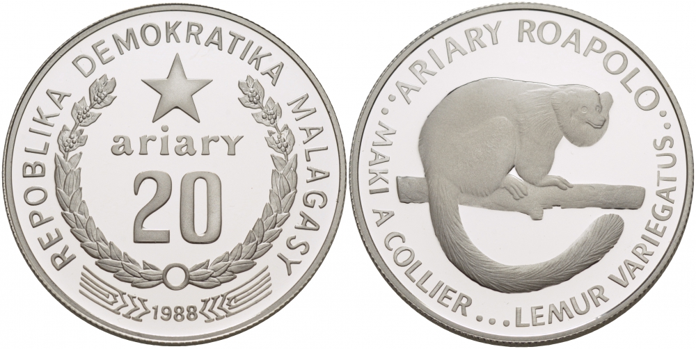 Мадагаскар 20 ариари 1988 серия 25 лет защиты окружающей среды KM 15 серебро PROOF 01-147-15