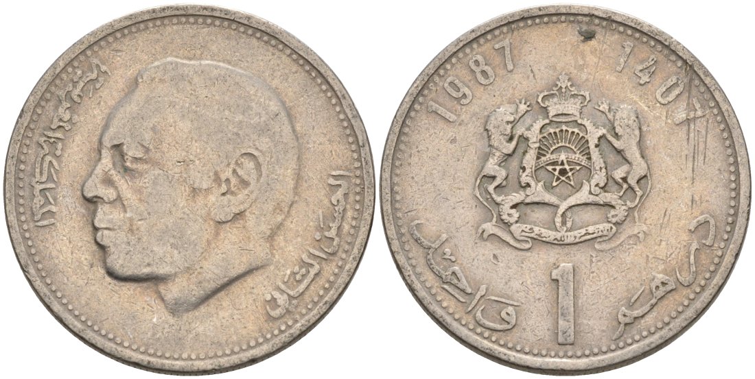 Марокко 1 дирхам 1987 АН1407, ХАСАН II KM 88 медно-никель 4573-627