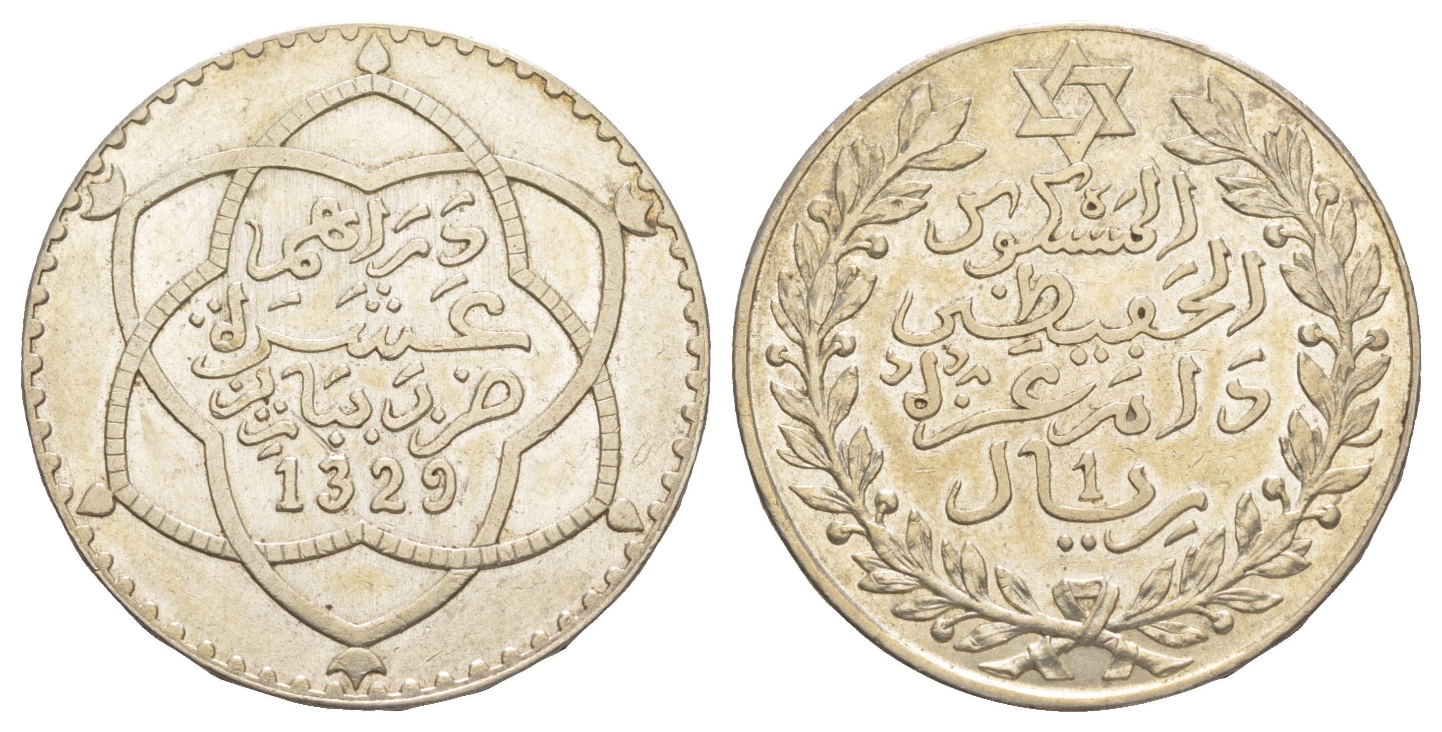 ----Марокко 1 риал 1911 AH 1329, Абд аль-Хафиз Y 25 серебро aUNC 00-903-03