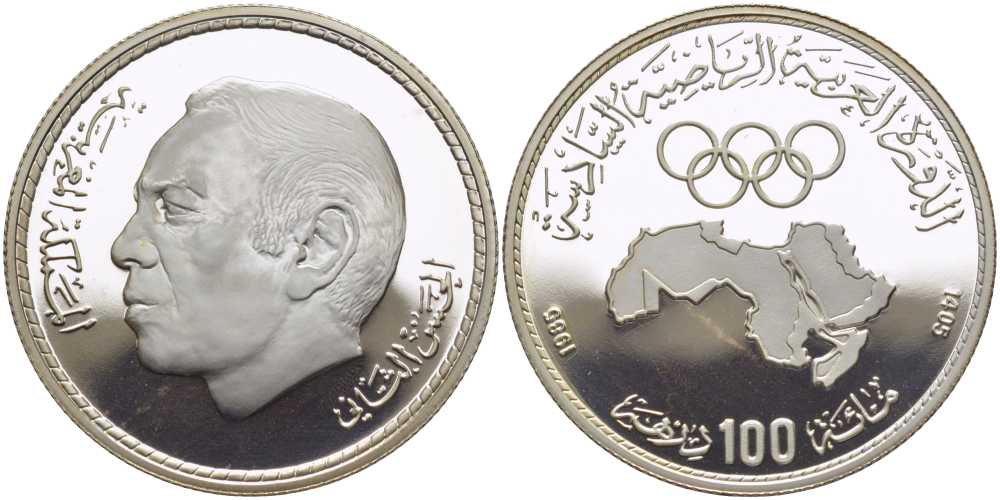 Марокко 100 дирхамов 1985 год 1405, аль-Хассан II (1962-1999), 6-ые Пан-Арабские игры, Олимпиада, тираж 300 экземпляров KM 77 серебро PROOF 00-803-15