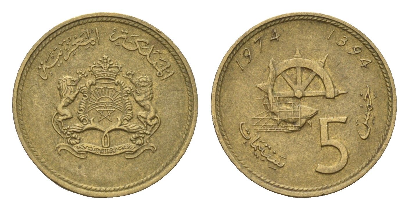 ----Марокко 5 сантимов 1974 АН 1394, FAO, Аль Хассан II (1962-1999) Y 59 латунь 4674-842