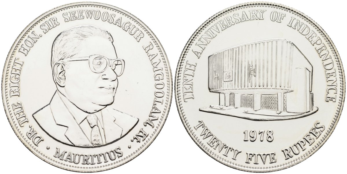 Маврикий 25 рупий 1978 10 лет независимости, тираж 20000 экземпляров KM 44 серебро UNC 1095-10-62