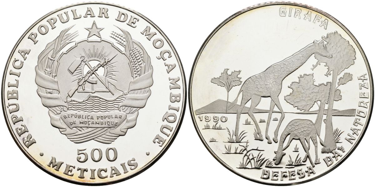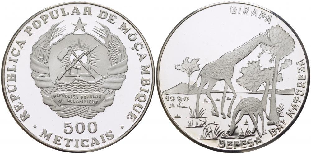 Мозамбик 500 метикалей 1990 серия защита окружающей среды, жирафы, тираж 2500 экз. KM 113 серебро PROOF 1076-9-52