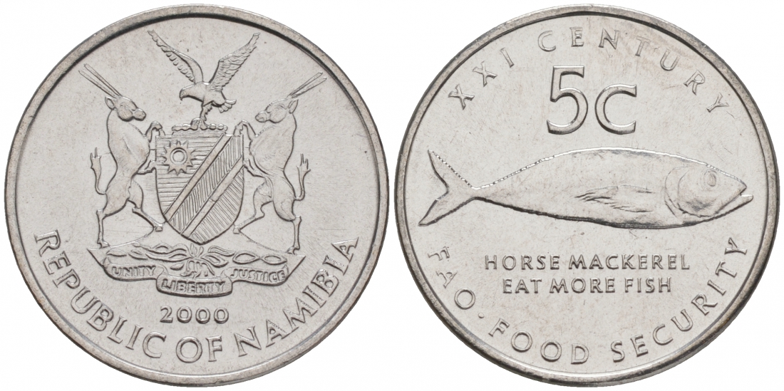 Намибия 5 центов 2000 FAO, рыба KM 16 нержавеющая сталь UNC M24-09