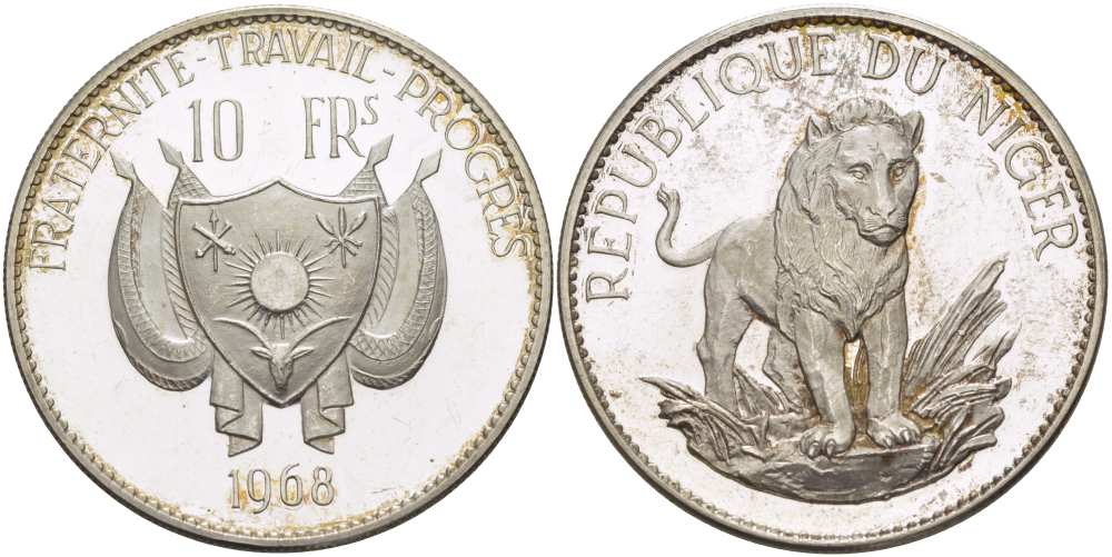 Нигер 10 франков 1968 лев, с чертой над Е, в слове Republique, тираж 1000 экземпляров KM 8.1 серебро PROOF 02-073-11