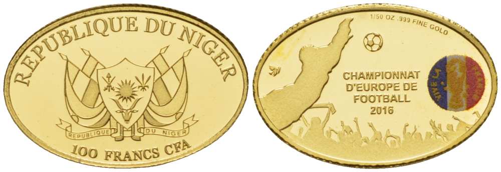 -Нигер 100 франков 2016 Чемпионат Европы по футболу во Франции, овал, эмаль золото PROOF 00-820-38ТунисЮАРАлжирСвазилендСейшельские островаСомалиСуданСьерра-ЛеонеТанзанияТогоУгандаФранцузская Западная АфрикаЦентрально-Африканские ШтатыЭкваториальная ГвинеяЭритреяЭфиопияСан-Томе и ПрисипиГвинея-БисауБенинБельгийское КонгоБерег слоновой костиМалиОстров ВознесенияЧадЗападная СахараДжибутиЦентральноафриканская Республика (ЦАР)ГабонМавританияСомалилендБуркина ФасоРодезияАнголаБотсванаБританская Западная АфрикаБурундиВосточная АфрикаГамбияГанаГвинеяЕгипетЗаир (Катанга)ЗамбияЗападно-Африканские ШтатыЗимбабвеКабо-ВердеКамерунКенияКоморские островаКонгоЛесотоЛиберияЛивияМаврикийМадагаскарМалавиМароккоМозамбикНамибияНигерияОстров Святой ЕленыРуандаДругие страны