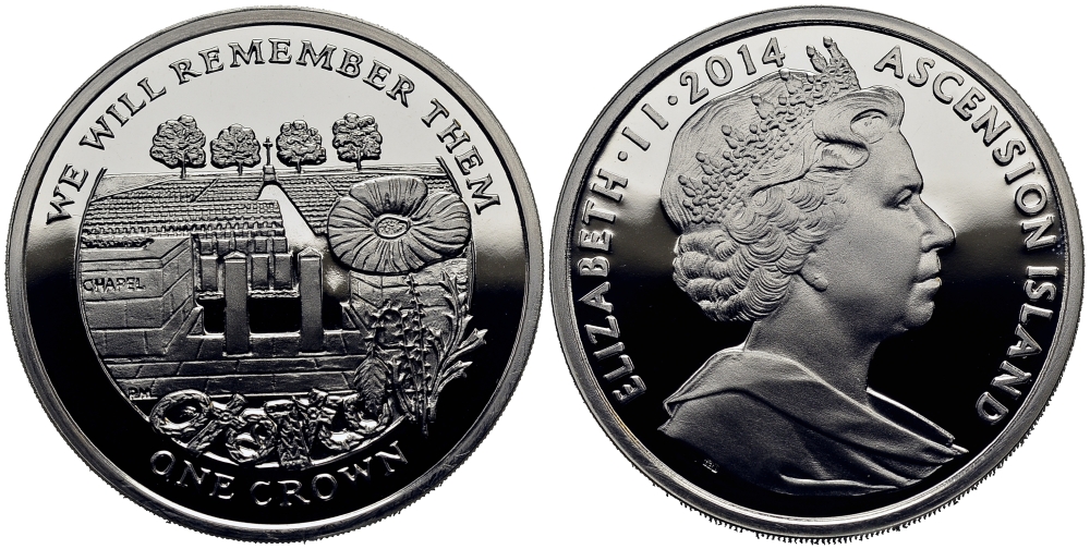 Остров Вознесения 1 крона 2014 в память героев первой мировой войны, кладбище KM NEW серебро PROOF 1071-1-62