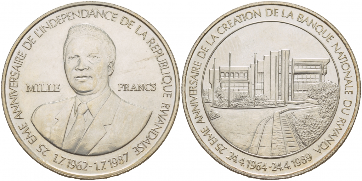 Руанда 1000 франков 1989 25 лет Национальному банку и 25 лет Независимости KM 17 серебро UNC 1088-7-44