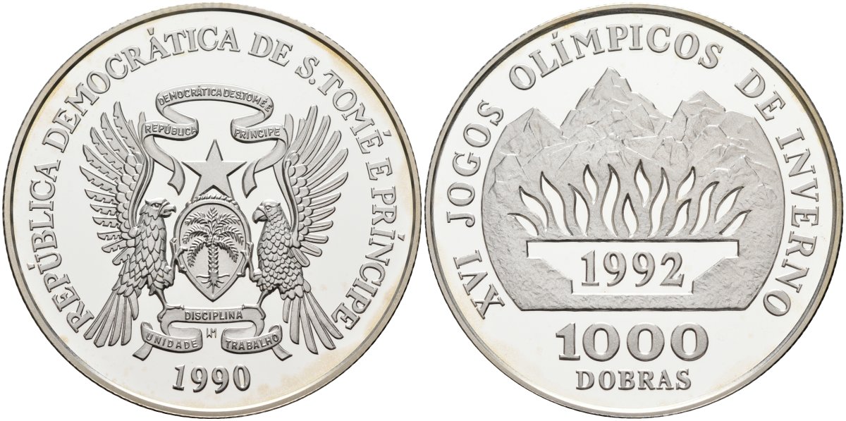 Сан-Томе и Принсипи 1000 добра 1990 XVI Зимние Олимпийские игры 1992 года в Альбервиле, тираж 10000 экз. KM 73 серебро PROOF 1098-1-21