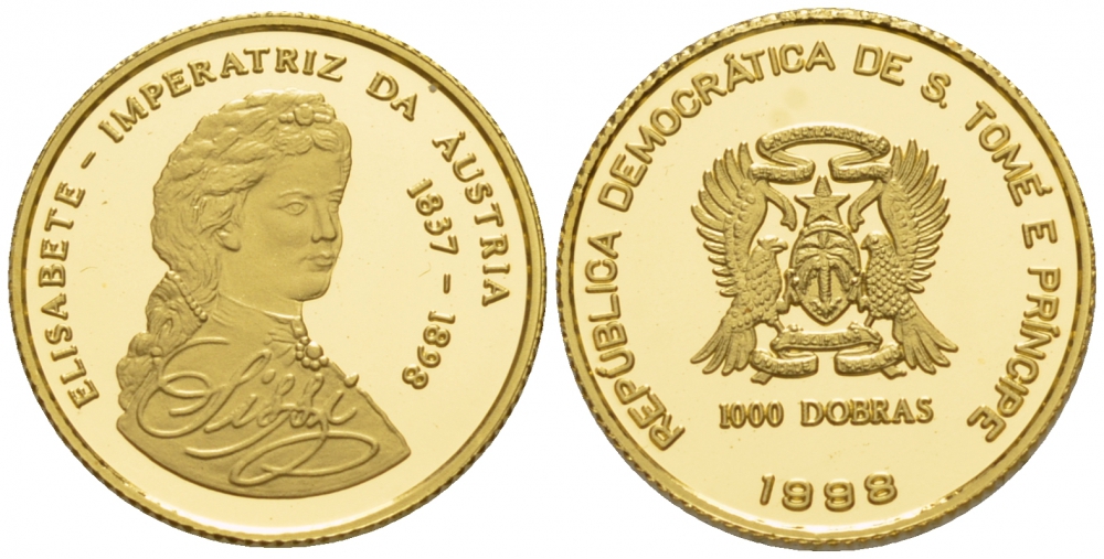 САН-ТОМЕ И ПРИНСИПЕ 1000 ДОБРАС 1998 ЕЛИЗВЕТА, ИМПЕРАТРИЦА АВСТРИИ KM золото PROOF 02-117-53