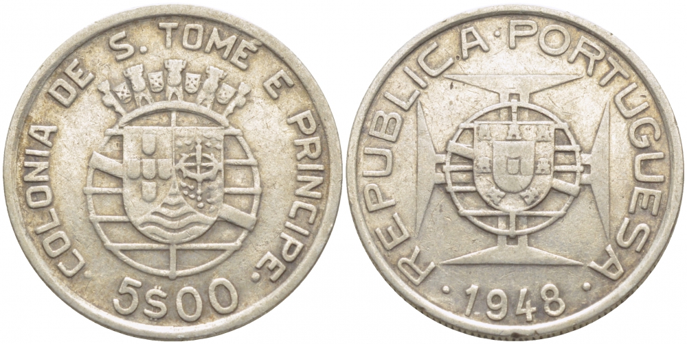 Португальское Сан-Томе и Принсипи 5 эскудо 1948 KM 6 серебро 413-2042