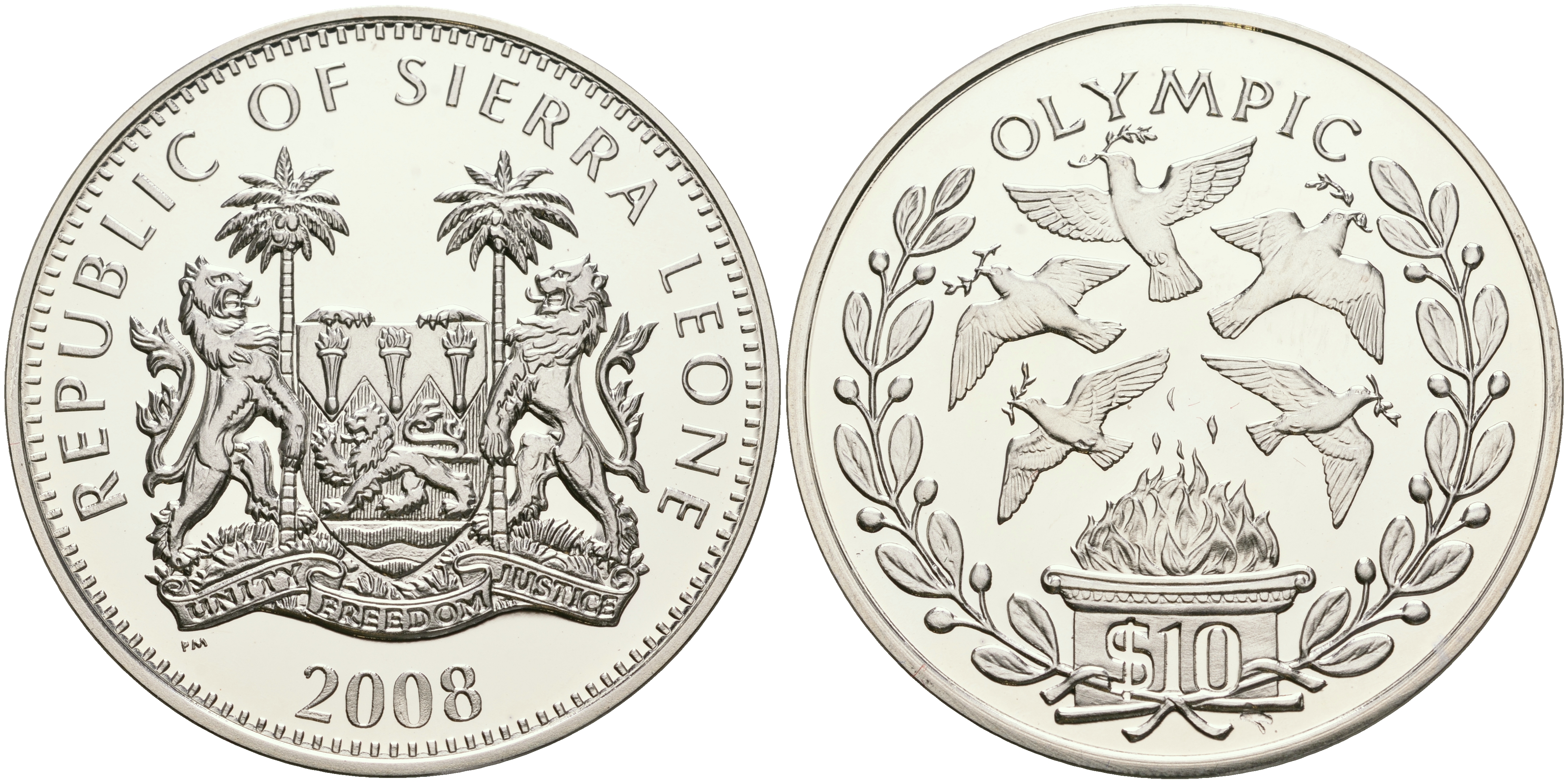 Сьерра-Леоне 10 долларов 2008 XXIX летние Олимпийские игры, Пекин 2008 - Голубь мира UC 229 серебро PROOF 1068-2-61