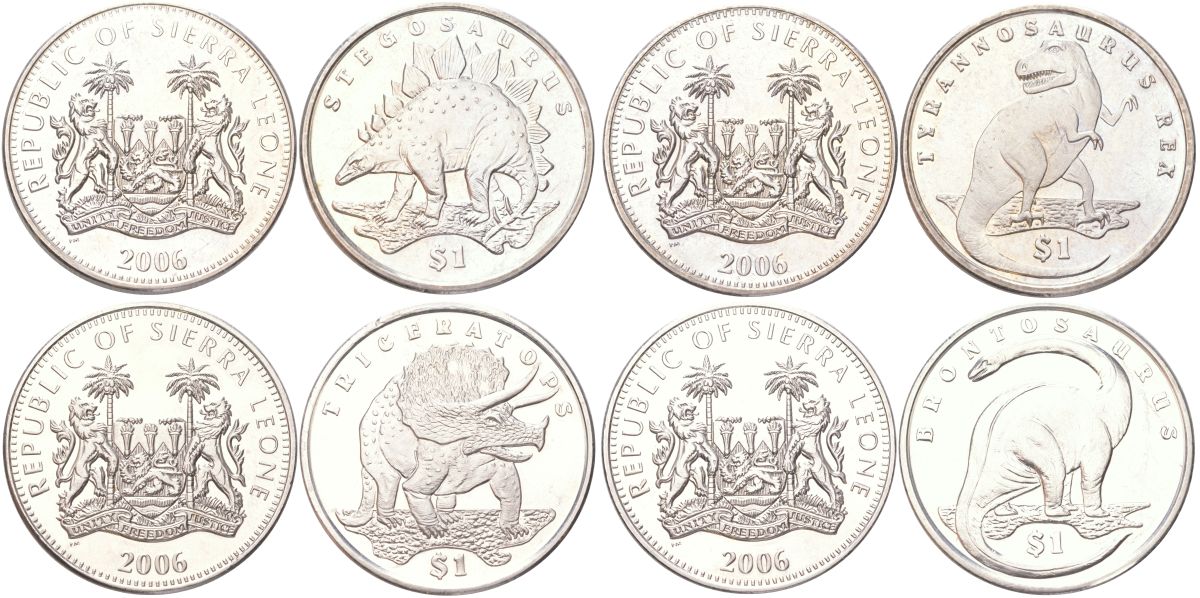 Сьерра-Леоне полный набор из 4 монет (1 доллар) 2006 Динозавры - Стегозавр, Тираннозавр, Трицератопс и Бронтозавр KM 308, 309, 310 и 324 медно-никель BU N3-36