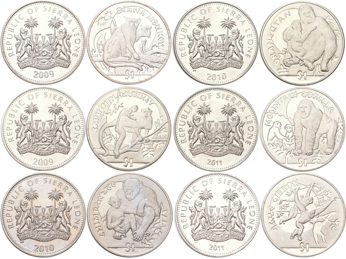 Сьерра-Леоне полный набор из 6 монет (1 доллар) 2009-2011 Обезьяны - Мартышка диана, Капуцин, Шимпанзе, Орангутан, Горная горилла, Чернорукий гиббон KM 364, 365, 366, 367, 368, 369 медно-никель BU 00-00