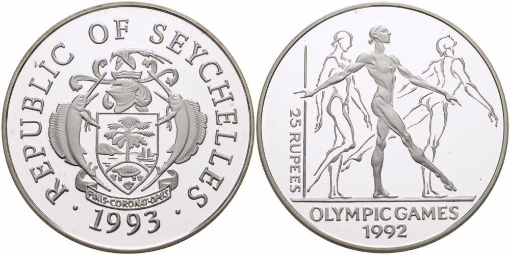 Сейшельские острова 25 рупий 1993 XXV летние олимпийские игры 1992 года в Барселоне, гиманстика, тираж 40000 экз. KM 70 серебро PROOF 04-174-14