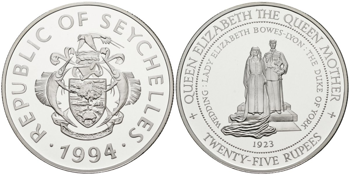 -Сейшельские острова 25 рупий 1994 серия королева Елизавета - королева мать, свадьба в 1923 году с графом Йоркским KM 79 серебро PROOF 1095-10-51ТунисЮАРАлжирСвазилендСомалиСуданСьерра-ЛеонеТанзанияТогоУгандаФранцузская Западная АфрикаЦентрально-Африканские ШтатыЭкваториальная ГвинеяЭритреяЭфиопияСан-Томе и ПрисипиГвинея-БисауБенинБельгийское КонгоБерег слоновой костиМалиНигерОстров ВознесенияЧадЗападная СахараДжибутиЦентральноафриканская Республика (ЦАР)ГабонМавританияСомалилендБуркина ФасоРодезияАнголаБотсванаБританская Западная АфрикаБурундиВосточная АфрикаГамбияГанаГвинеяЕгипетЗаир (Катанга)ЗамбияЗападно-Африканские ШтатыЗимбабвеКабо-ВердеКамерунКенияКоморские островаКонгоЛесотоЛиберияЛивияМаврикийМадагаскарМалавиМароккоМозамбикНамибияНигерияОстров Святой ЕленыРуандаДругие страны