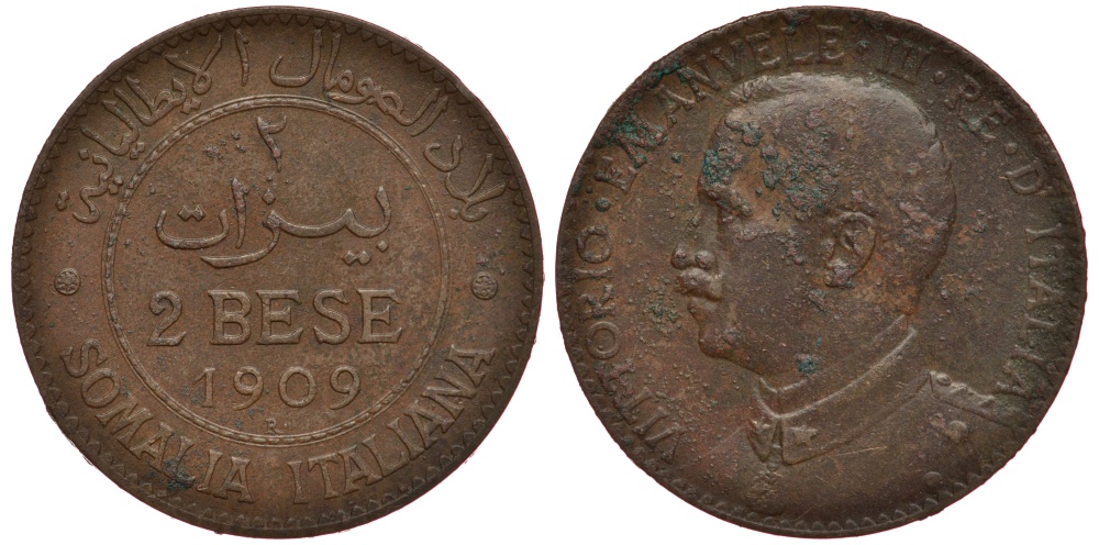 ИТАЛЬЯНСКОЕ СОМАЛИ 2 БЕСЕ 1909 R, ВИТТОРИО ЭМАНУЭЛЕ III КМ 2 бронза 5010-414