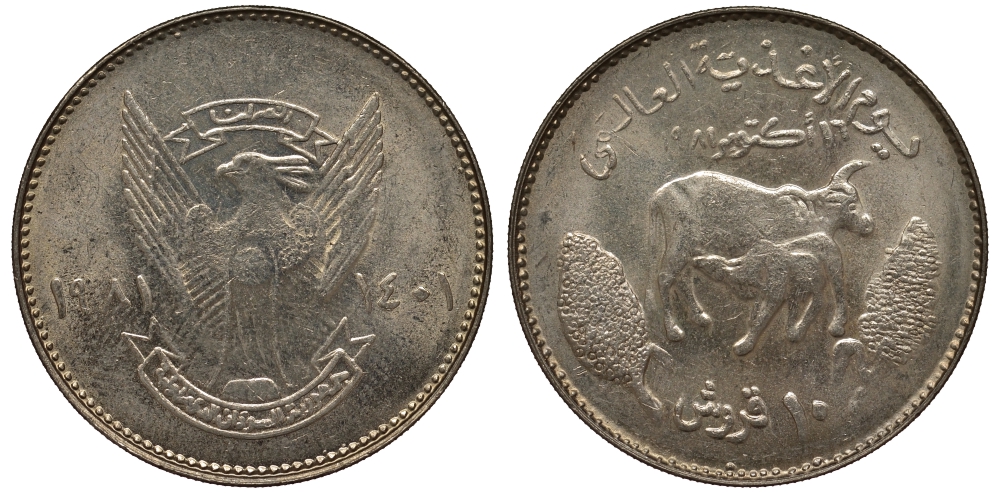 Судан 10 гирш 1981 FAO, буйволы, международный день еды KM 85 медно-никель UNC M24-06