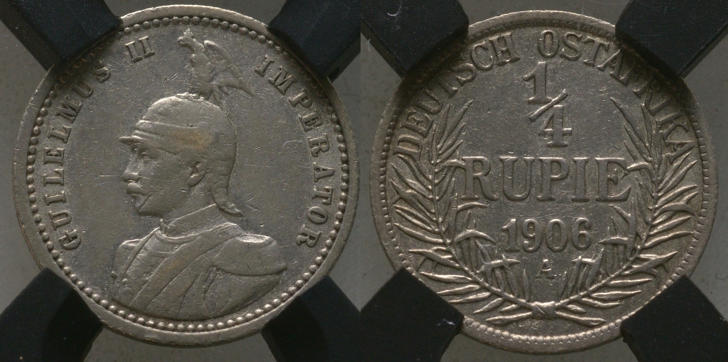 ----Немецкая Восточная Африка (Танзания) 1/4 рупии 1906 A, Ost-Africa, Вильгельм II (1888-1918), в слабе RNGA XF 40 Jaeger 720, KM 8 серебро 15-011-03