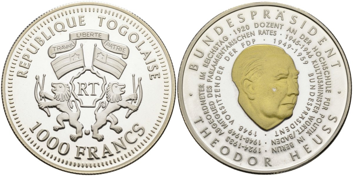 Того 1000 франков 2004 федеральный президент (1949-1959), Теодор Хойс, позолота серебро PROOF 04-318-33