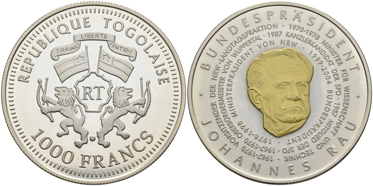 Того 1000 франков 2004 федеральный президент (1999-2004), Йоханнес Рау, позолота серебро PROOF 04-318-35