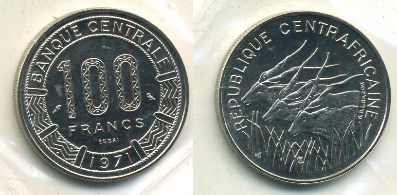 ЦЕНТРАЛЬНО-АФРИКАНСКАЯ РЕСПУБЛИКА 100 ФРАНКОВ 1971 PROBA, ESSAI, в оригинальной упаковке KM E2 медно-никель UNC 5010-734