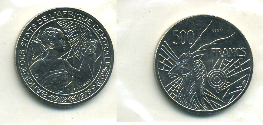 ЦЕНТРАЛЬНО-АФРИКАНСКИЕ ШТАТЫ 500 ФРАНКОВ 1976 ПРОБНИК, ESSAI, ЧАД, в оригинальной упаковке KM E9 никель UNC 5010-131