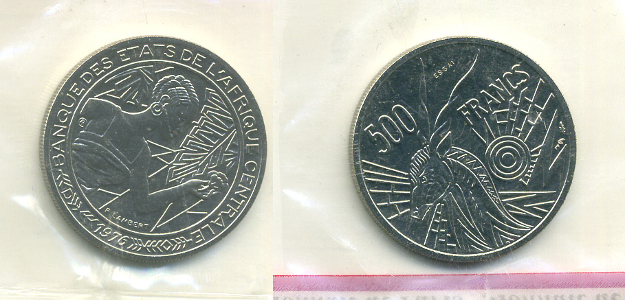 ЦЕНТРАЛЬНО-АФРИКАНСКИЕ ШТАТЫ 500 ФРАНКОВ 1976 ПРОБНИК, ESSAI, ГАБОН, в оригинальной упаковке KM E9 никель UNC 5010-134