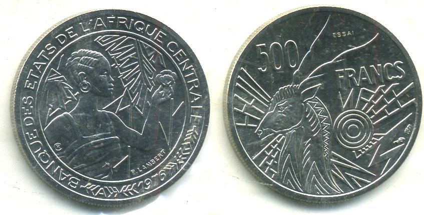 Центрально-Африканские штаты 500 франков 1976 пробник, ESSAI, Камерун, Е KM 12E никель UNC 5010-745