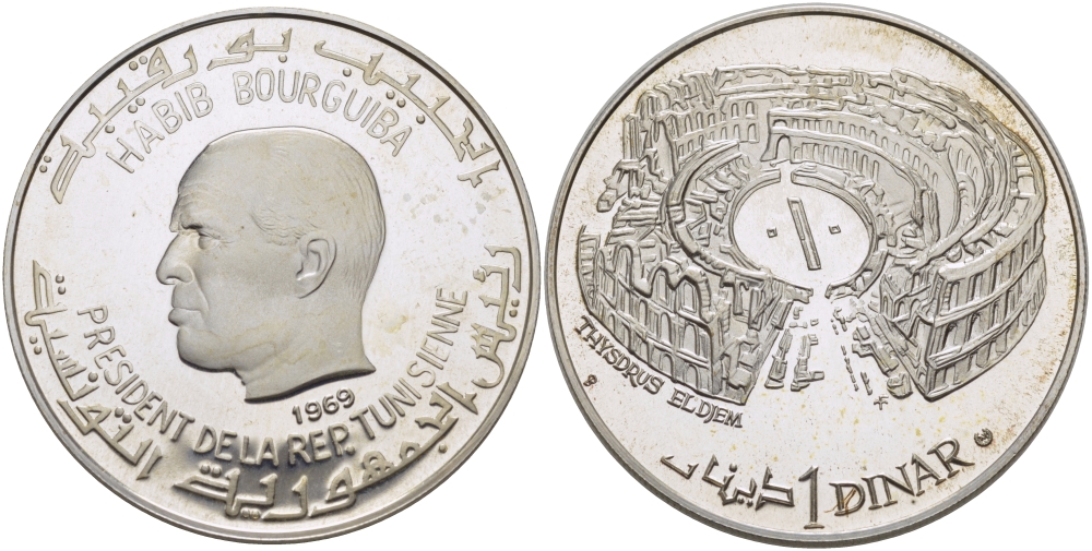 ----Тунис 1 динар 1969 Хабиб Бургиба, африканский колизей в Эль-Джеме KM 300 серебро PROOF 11-182-25