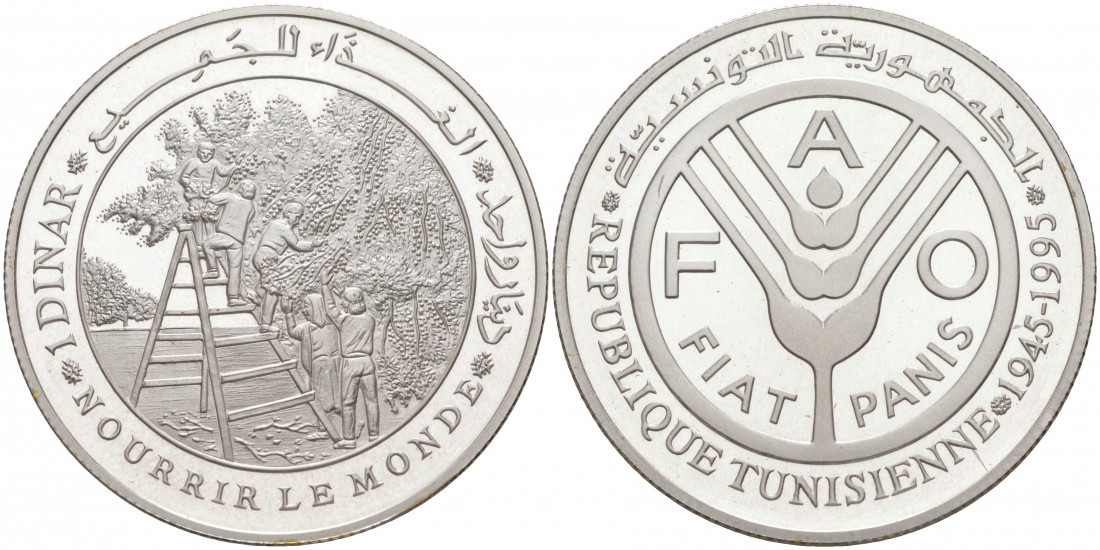 ----Тунис 1 динар 1995 50 лет FAO, сбор урожая в фруктовом саду, тираж 5000 экземпляров KM 351 серебро PROOF 1066-1-33