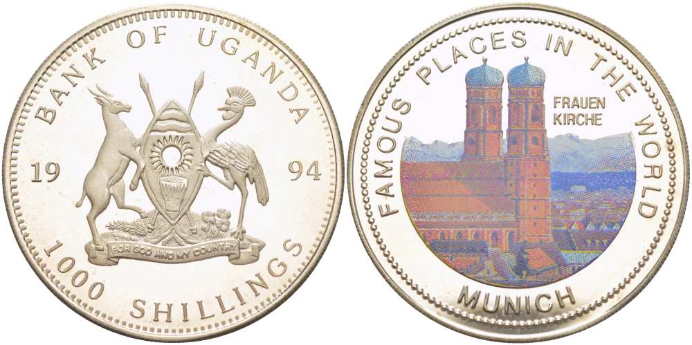 УГАНДА 1000 ШИЛЛИНГОВ 1994 FRAUEN KIRCHE В МЮНХЕНЕ, ЦВЕТНАЯ ЭМАЛЬ, ТИРАЖ 15000 ЭКЗ. KM 49 медно-никель PROOF 1085-6-61