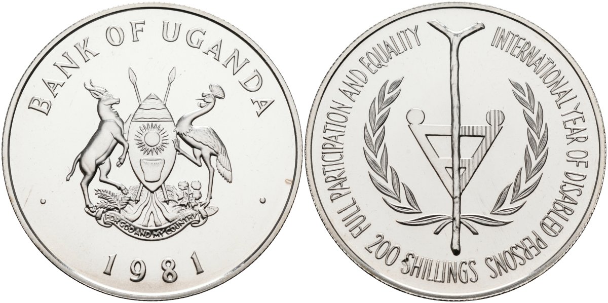 Уганда 200 шиллингов 1981 международный год инвалидов, тираж 10000 экз. KM 26 серебро UNC 1098-2-34