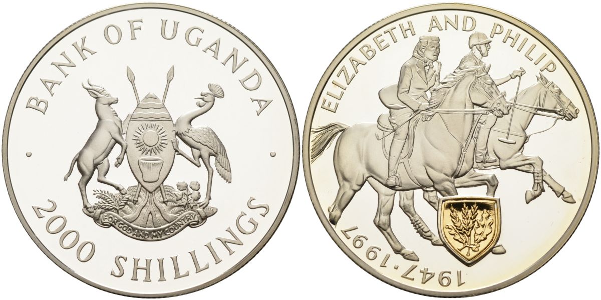 Уганда 2000 шиллингов 1997 50 лет (золотая) свадьба Елизаветы и Филиппа, позолота KM 63a серебро PROOF 04-322-13