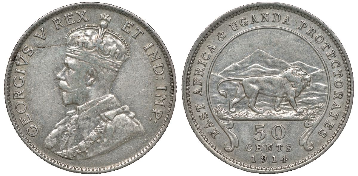 Британская Восточная Африка и Уганда 50 центов 1914 H, Георг V, лев, монетный двор Хитон KM 9 серебро 1528-833